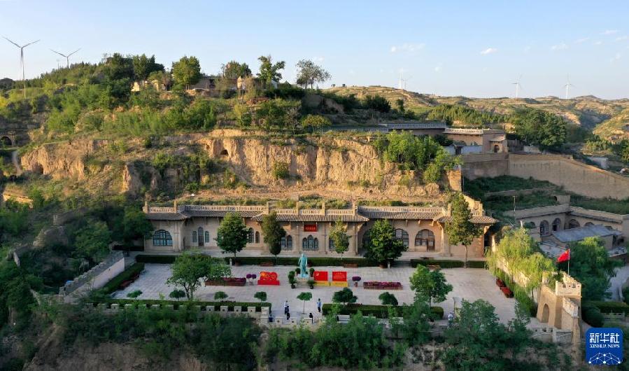 游人在陕西省榆林市米脂县杨家沟革命旧址参观(9月10日摄,无人机照片)。新华社记者陶明摄