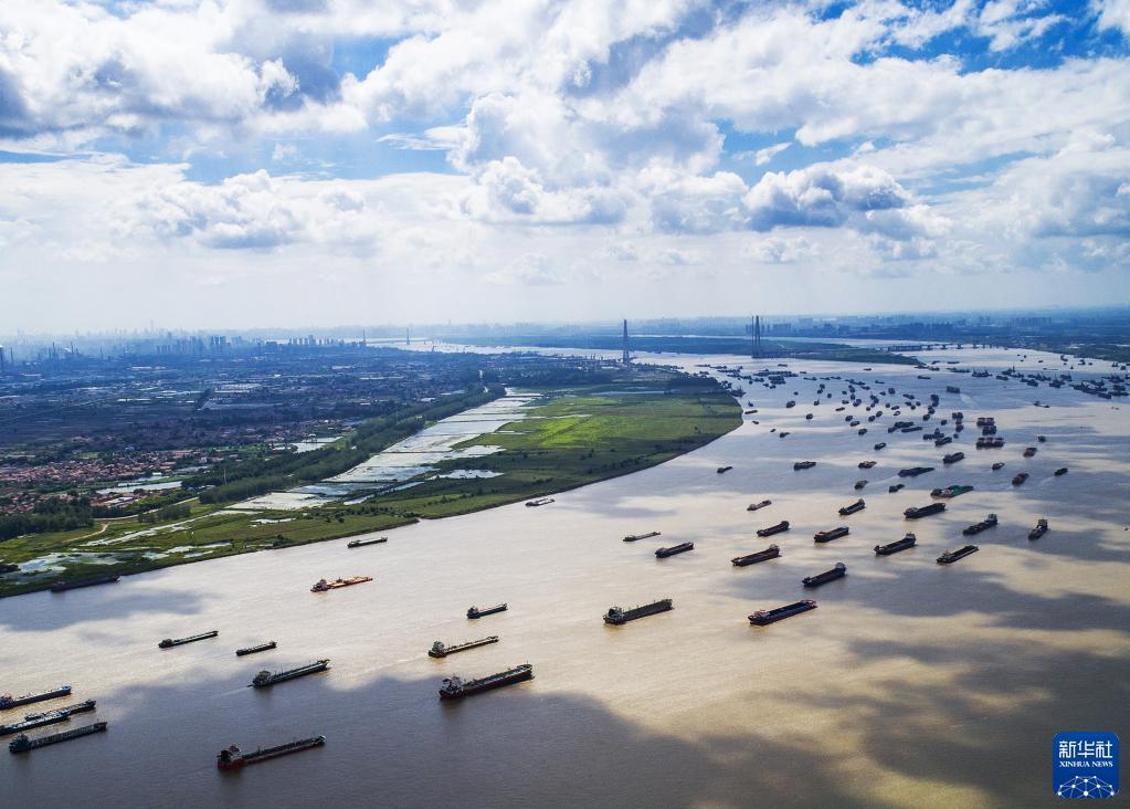 船舶在湖北省武汉市阳逻港区水域行驶(2018年8月13日摄,无人机照片)。新华社记者肖艺九摄
