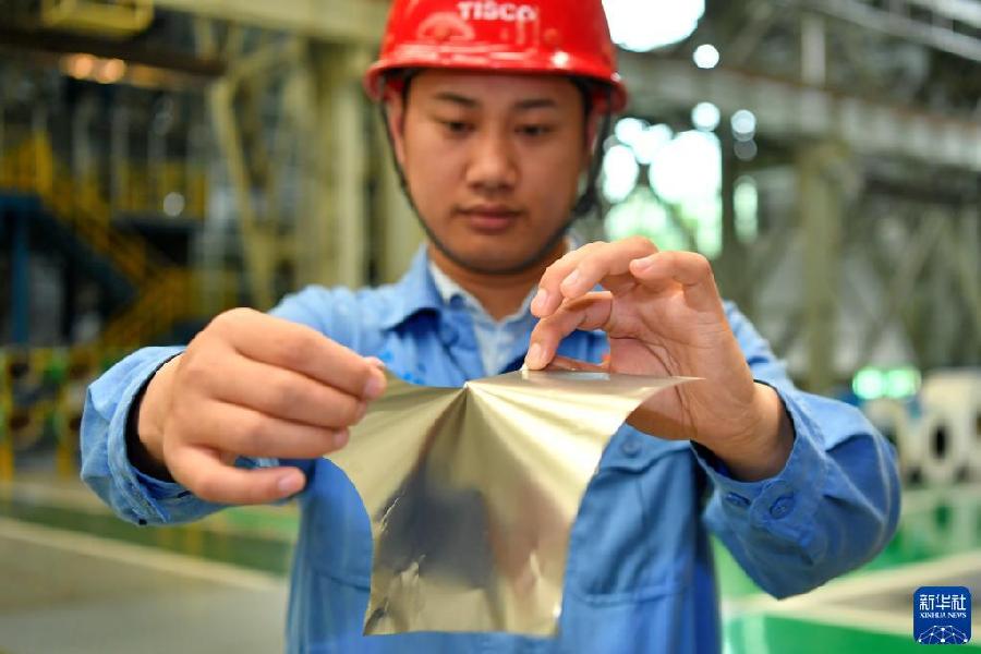 在位于山西的太钢集团,员工展示用手撕开0.02毫米厚的超薄带状不锈钢(2019年5月24日摄)。新华社记者曹阳摄