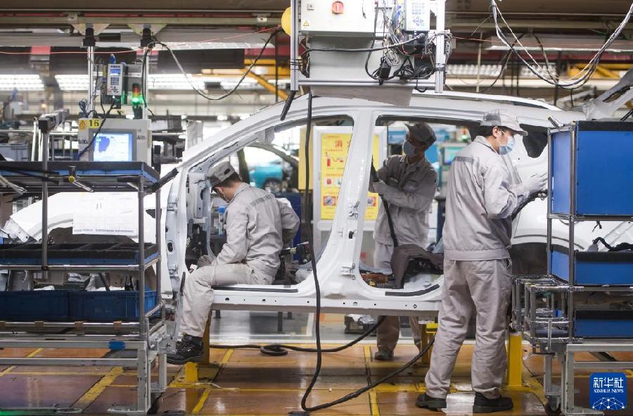2020年3月24日,工人在湖北武汉东风乘用车公司工厂总装车间的流水线上作业。2020年3月下旬左右,武汉各企业开始陆续复工复产。新华社记者肖艺九摄