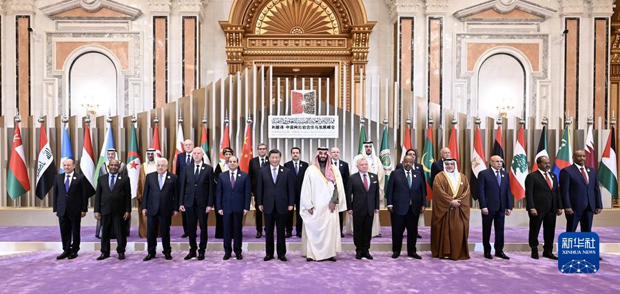 当地时间12月9日下午,首届中国-阿拉伯国家峰会在沙特首都利雅得阿卜杜勒阿齐兹国王国际会议中心举行。国家主席习近平和沙特王储兼首相穆罕默德、埃及总统塞西、约旦国王阿卜杜拉二世、巴林国王哈马德、科威特王储米沙勒、突尼斯总统赛义德、吉布提总统盖莱、巴勒斯坦总统阿巴斯、卡塔尔埃米尔塔米姆、科摩罗总统阿扎利、毛里塔尼亚总统加兹瓦尼、伊拉克总理苏达尼、摩洛哥首相阿赫努什、阿尔及利亚总理阿卜杜拉赫曼、黎巴嫩总理米卡提等21个阿盟国家领导人以及阿拉伯国家联盟秘书长盖特等国际组织负责人出席峰会。习近平在会上发表题为《弘扬中阿友好精神携手构建面向新时代的中阿命运共同体》的主旨讲话。新华社记者谢环驰摄