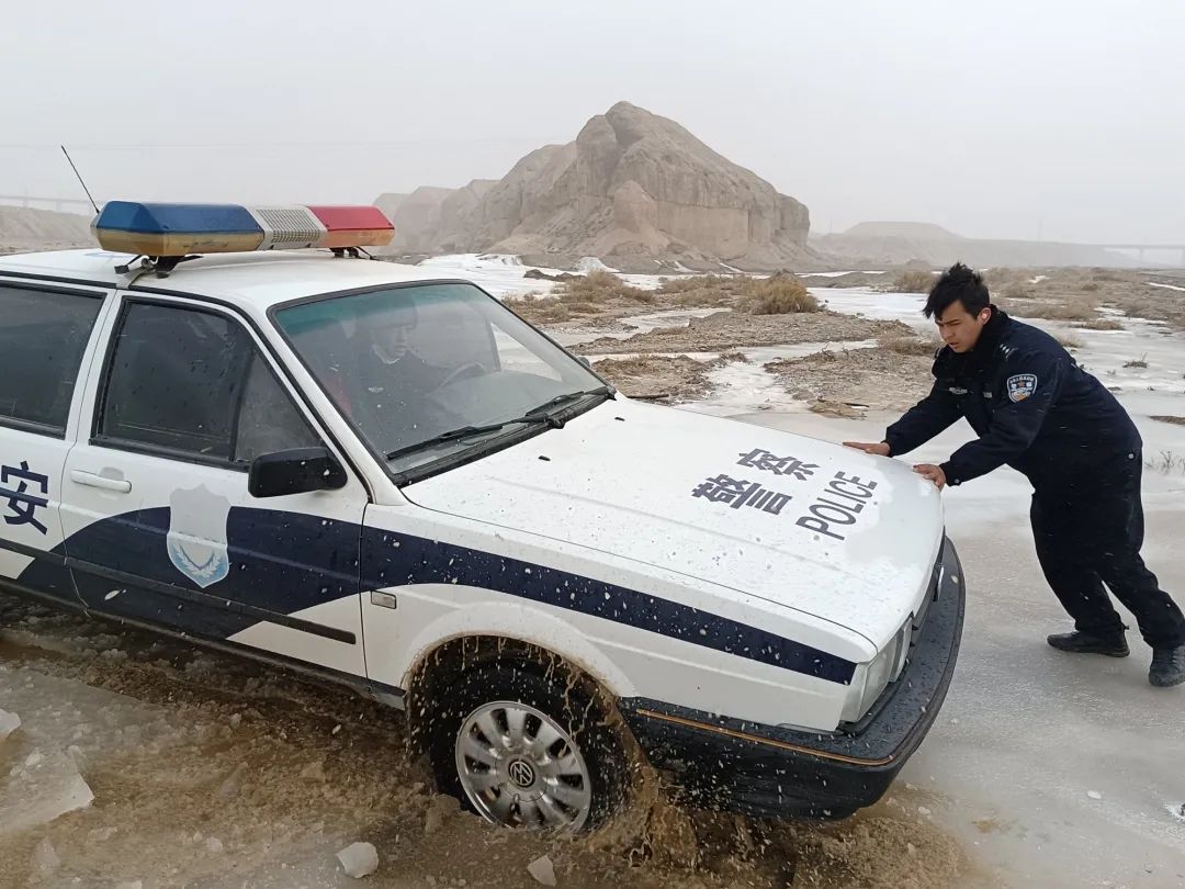 巡线途中,警车陷入冰河中,民警在冰水里推车,试图冲过融水的冰面。李强 摄