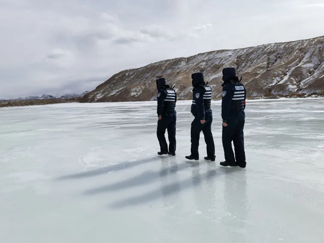 民警徒步穿越冰河,对辖区重要桥梁、隧道、涵洞进行安全检查。常彦东 摄